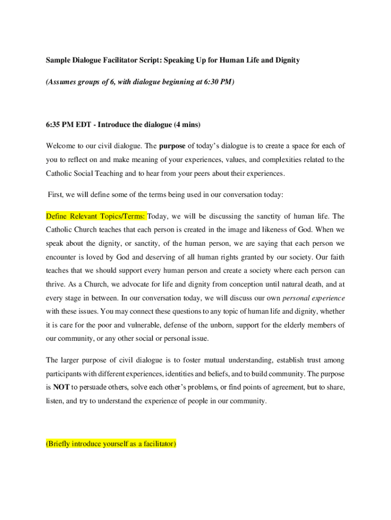Sample Dialogue Facilitator Script: Speaking Up for Human Life and Dignity (Assumes groups of 6, with dialogue beginning at 6:30 PM)6:35 PM EDT Introduces the dialogue (4 mins) Welcome to our civil