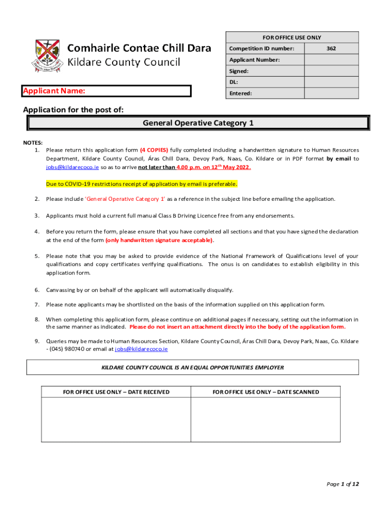 FOR OFFICE USE ONLY Competition ID number:362Applicant Number: Signed: DL:Applicant Name:Entered:Application for the post of: General Operative Category 1 NOTES: 1. Please return this application