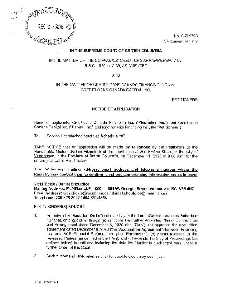 Vancouver Registry IN THE SUPREME COURT OF BRITISH COLUMBIAN THE MATTER OF THE COMPANIES\' CREDITORS ARRANGEMENT ACT,