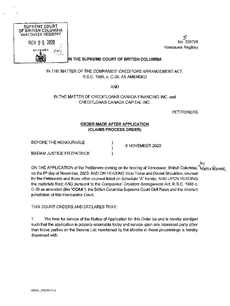 SUPREME COURT OF BRITISH COLU4BIA VANCOUVER REGISTRY5NOV .0 6 OUZO Naidoo. 209798 Vancouver RegistryitHYTHE SUPREME COURT OF BRITISH COLUMBIA IN THE MATTER OF THE COMPANIES\' CREDITORS ARRANGEMENT
