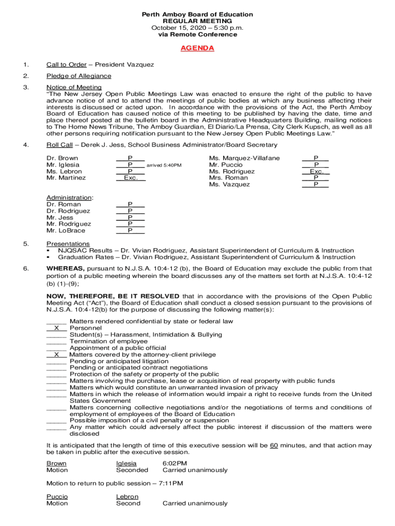 Perth Amboy Board of Education REGULAR MEETING October 15, 2020 5:30 p.m. via Remote ConferenceAGENDA 1. Call to Order President Vazquez2. Pledge of Allegiance3. Notice of Meeting The New Jersey Open