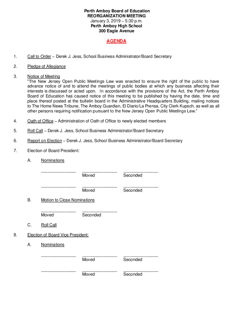 Perth Amboy Board of Education REORGANIZATION MEETING January 3, 2019 5:30 p.m. Perth Amboy High School 300 Eagle AvenueAGENDA 1. Call to Order Derek J. Jess, School Business Administrator/Board Secretary2.