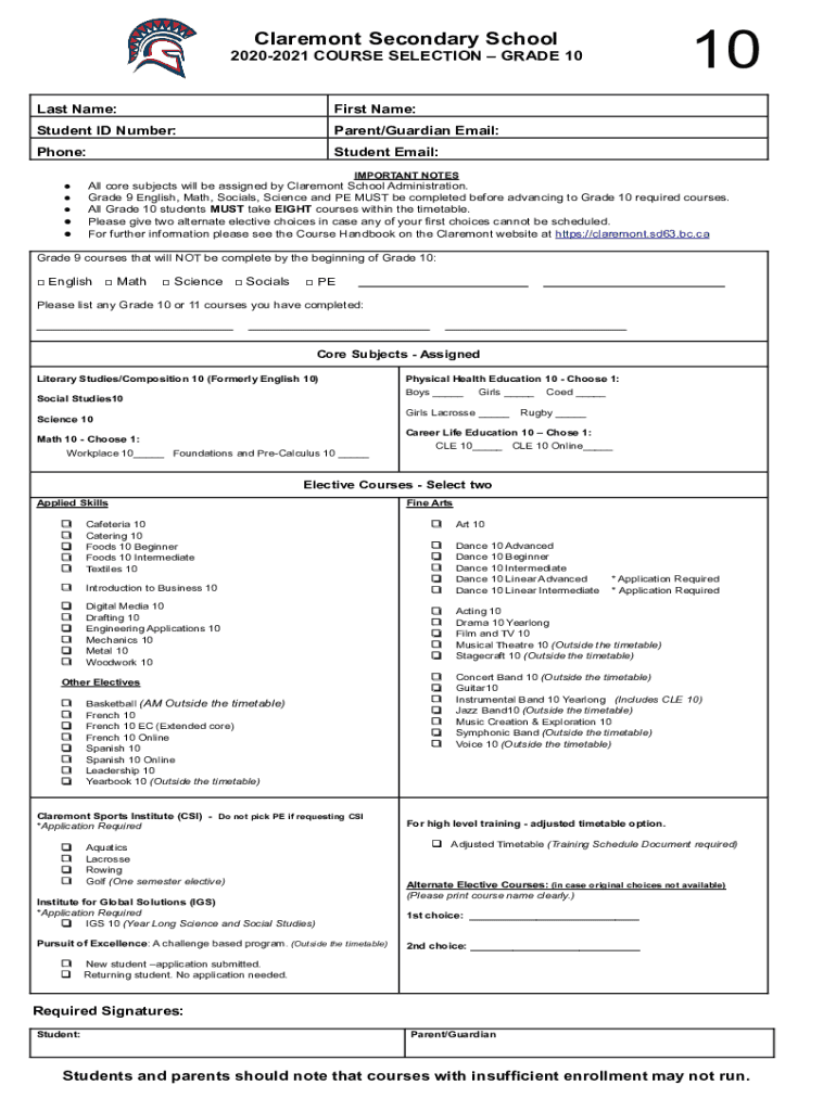 10Claremont Secondary School 20202021 COURSE SELECTION GRADE 10Last Name:First Name:Student ID Number:Parent/Guardian Email:Phone:Student Email: IMPORTANT NOTES All core subjects will be assigned