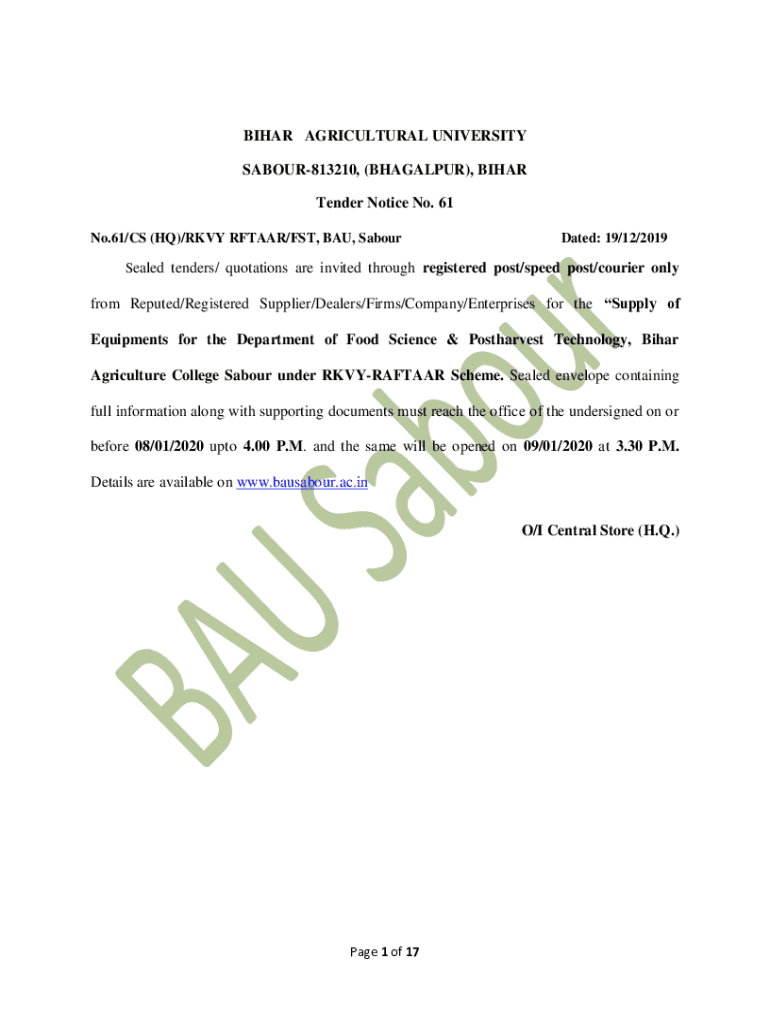 Get the free Tender Notice No. 61 - Bihar Agriculture University - bausabour ac