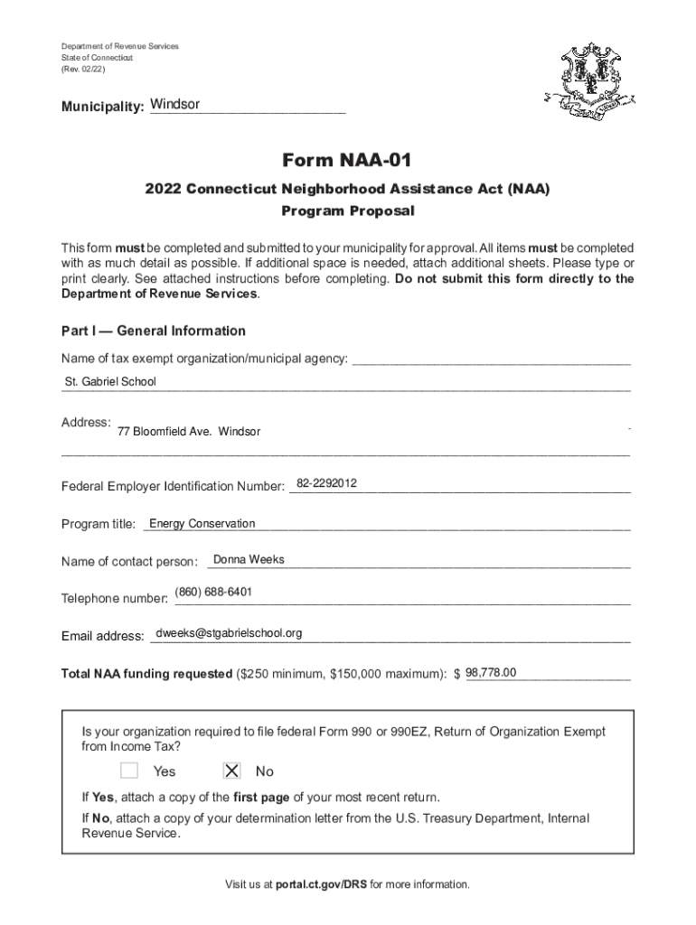 Department of Revenue Services State of Connecticut (Rev. 02/22)Print Forrest Form Windsor Municipality: ___Form NAA01 2022 Connecticut Neighborhood Assistance Act (NASA) Program Proposal This form