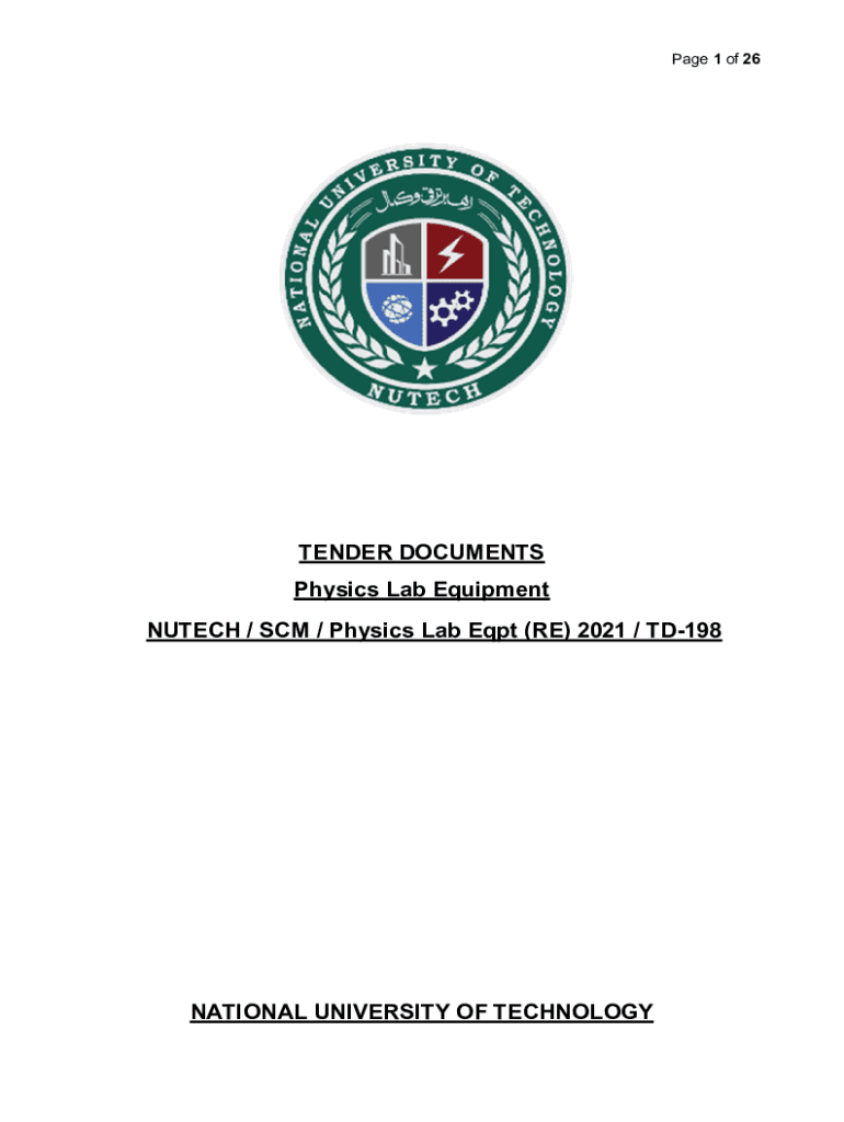 Page 1 of 26TENDER DOCUMENTSPhysics Lab EquipmentNUTECH / SCM / Physics Lab EPT (RE) 2021 / TD198NATIONAL UNIVERSITY OF TECHNOLOGY Page 2 of 26TENDER NOTICENational University of Technology (DUTCH)DUTCH