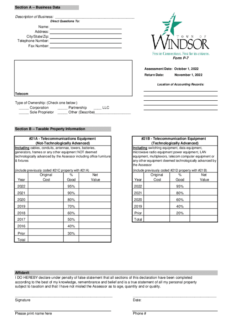 Section A Business Data Description of Business: ___ Direct Questions To:Name: Address: City/State/Zip: Telephone Number: Fax Number: Form P7 Assessment Date: October 1, 2022, Return Date:November