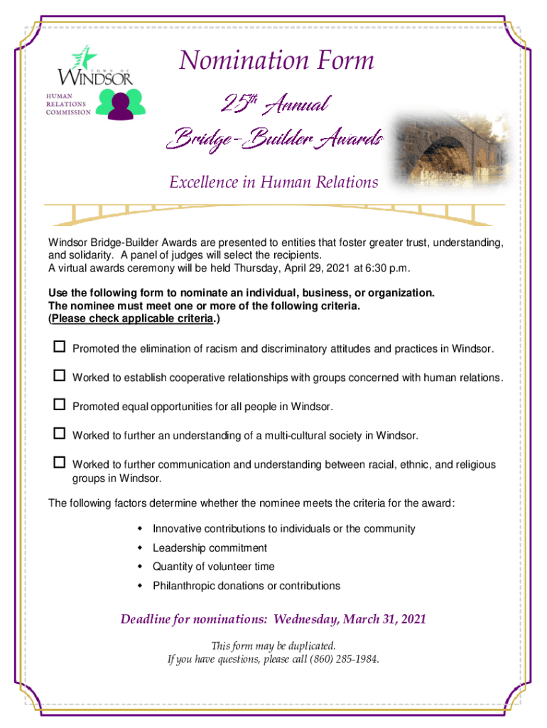 Nomination FormExcellence in Human Relations Windsor BridgeBuilder Awards are presented to entities that foster greater trust, understanding, and solidarity. A panel of judges will select the recipients.