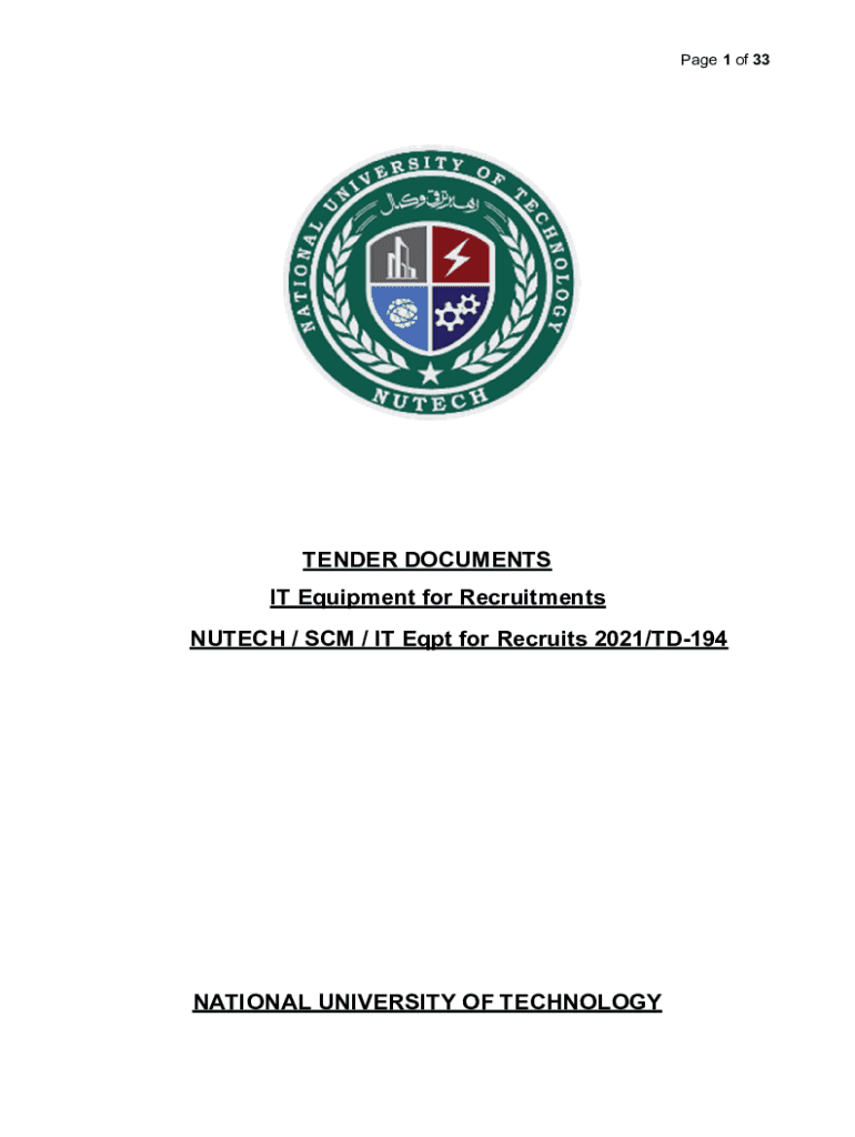 Page 1 of 33TENDER DOCUMENT SIT Equipment for RecruitmentsNUTECH / SCM / IT EPT for Recruits 2021/TD194NATIONAL UNIVERSITY OF TECHNOLOGY Page 2 of 33TENDER NOTICENational University of Technology