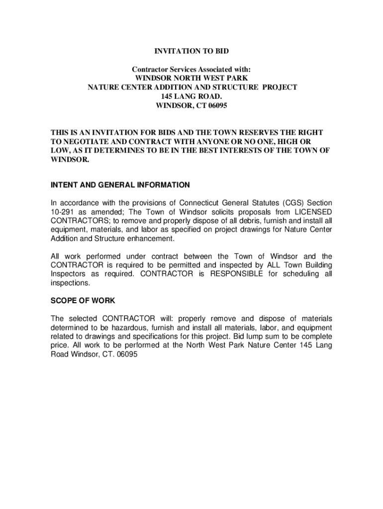 INVITATION TO BID Contractor Services Associated with: WINDSOR NORTH WEST PARK NATURE CENTER ADDITION AND STRUCTURE PROJECT 145 LANG ROAD. WINDSOR, CT 06095THIS IS AN INVITATION FOR BIDS AND THE TOWN