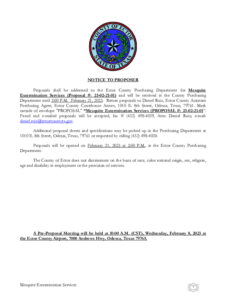 NOTICE TO PROPOSER Proposals shall be addressed to the Actor County Purchasing Department for Mesquite Extermination Services (Proposal #: 23022101) and will be received at the County Purchasing Department