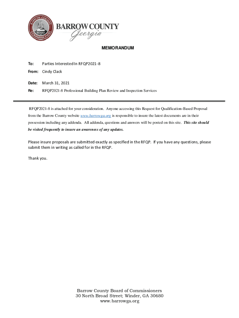 MEMORANDUM To:Parties Interested In RFQP20218From: Cindy Clack Date:March 31, 2021Re:RFQP20218 Professional Building Plan Review and Inspection ServicesRFQP20218 is attached for your consideration.