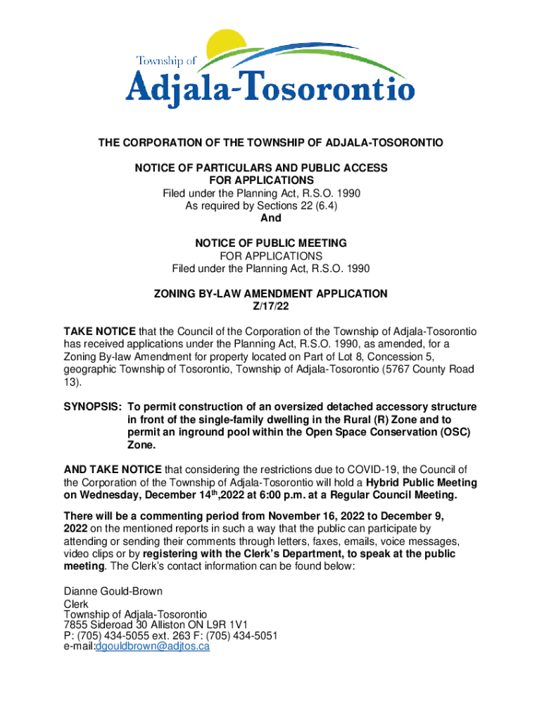 THE CORPORATION OF THE TOWNSHIP OF ADJALATOSORONTIO NOTICE OF PARTICULARS AND PUBLIC ACCESS FOR APPLICATIONS Filed under the Planning Act, R.S.O. 1990 As required by Sections 22 (6.4) And NOTICE OF