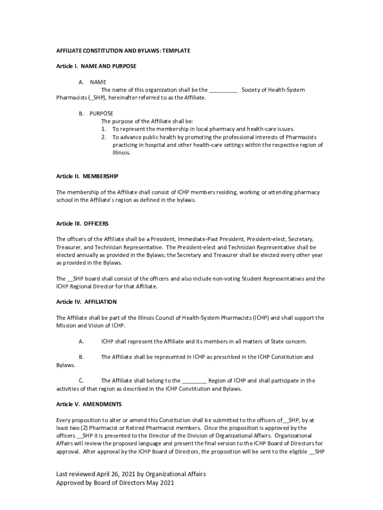 AFFILIATE CONSTITUTION AND BYLAWS: TEMPLATE Article I. NAME AND PURPOSE A. NAME The name of this organization shall be the ___ Society of HealthSystem Pharmacists (_SHP), hereinafter referred to as