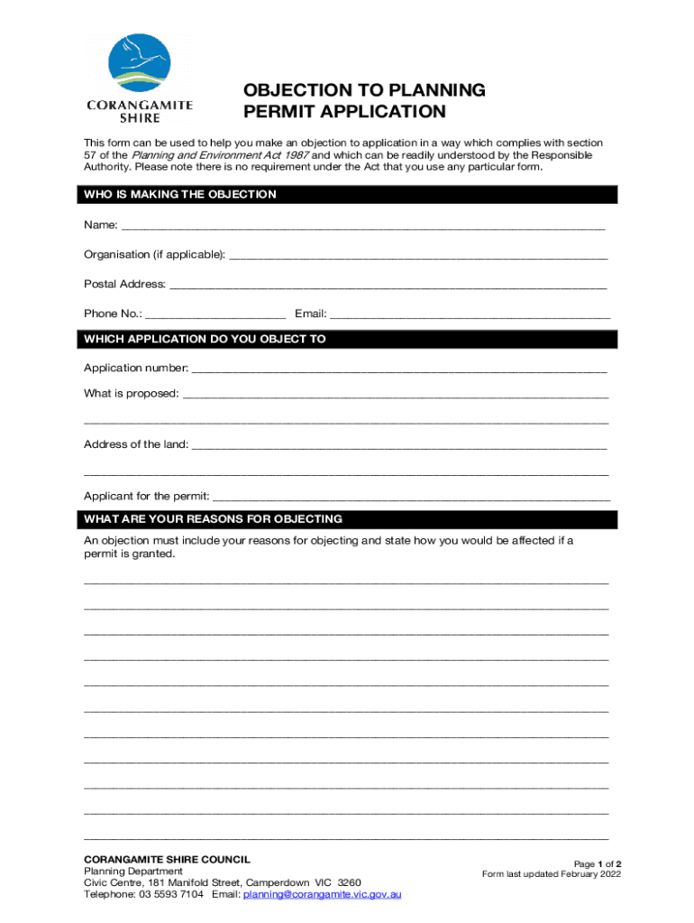 OBJECTION TO PLANNING PERMIT APPLICATION This form can be used to help you make an objection to application in a way which complies with section 57 of the Planning and Environment Act 1987 and which