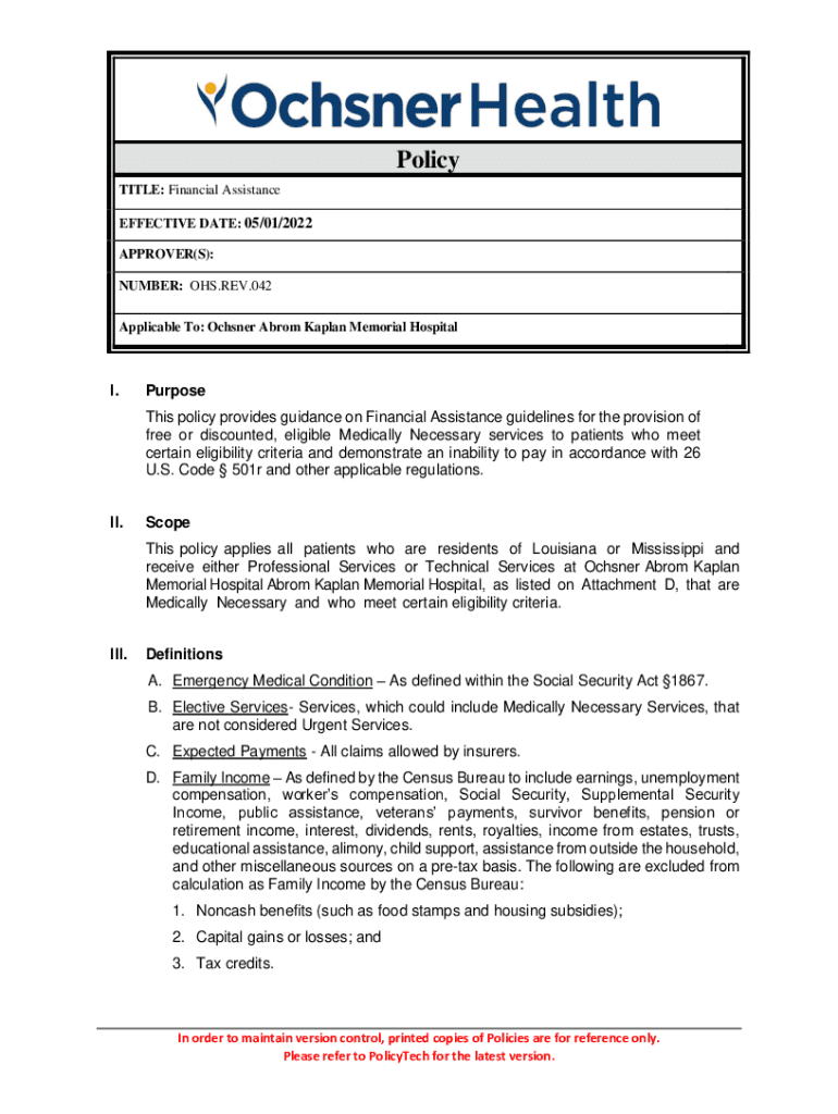 Policy TITLE: Financial Assistance EFFECTIVE DATE: 05/01/2022 APPROVER(S): NUMBER: OHS.REV.042 Applicable To: Ocher Abram Kaplan Memorial Hospital. Purpose This policy provides guidance on Financial