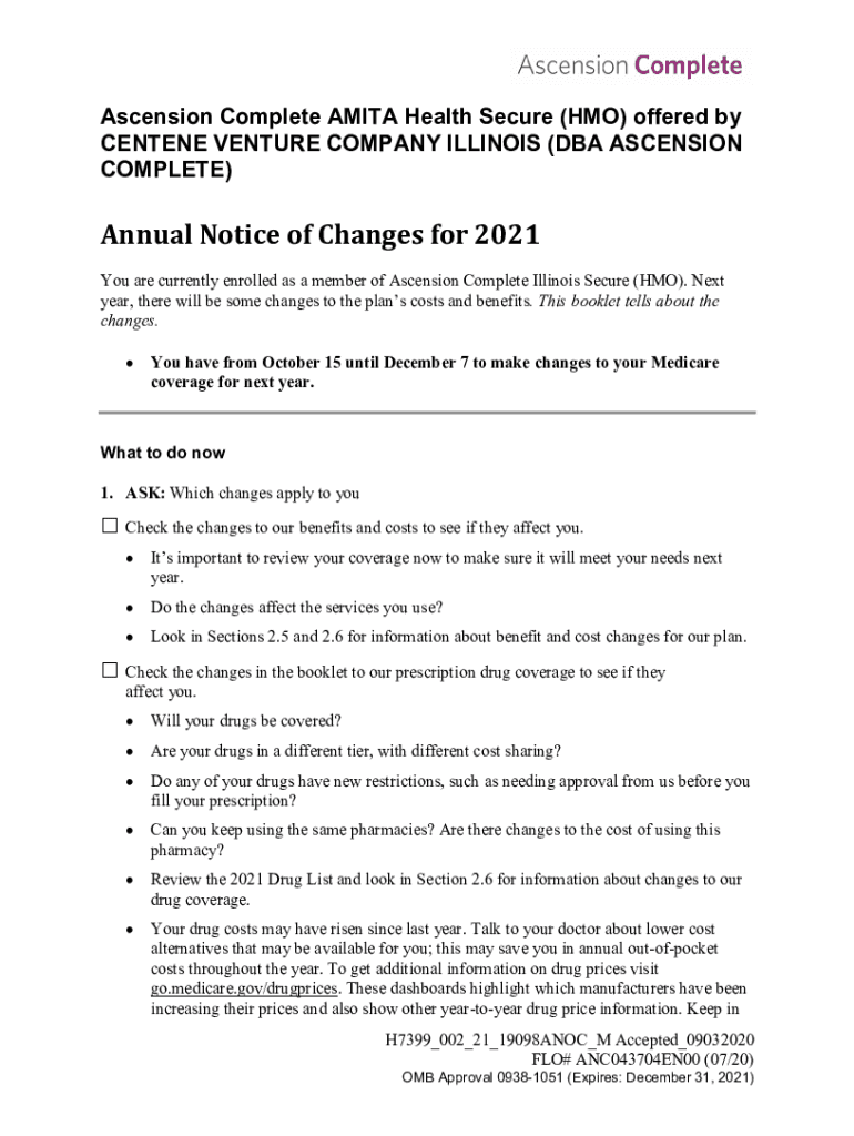 Ascension Complete AMIGA Health Secure (HMO) offered by CENT ENE VENTURE COMPANY ILLINOIS (DBA ASCENSION COMPLETE)Annual Notice of Changes for 2021 You are currently enrolled as a member of Ascension