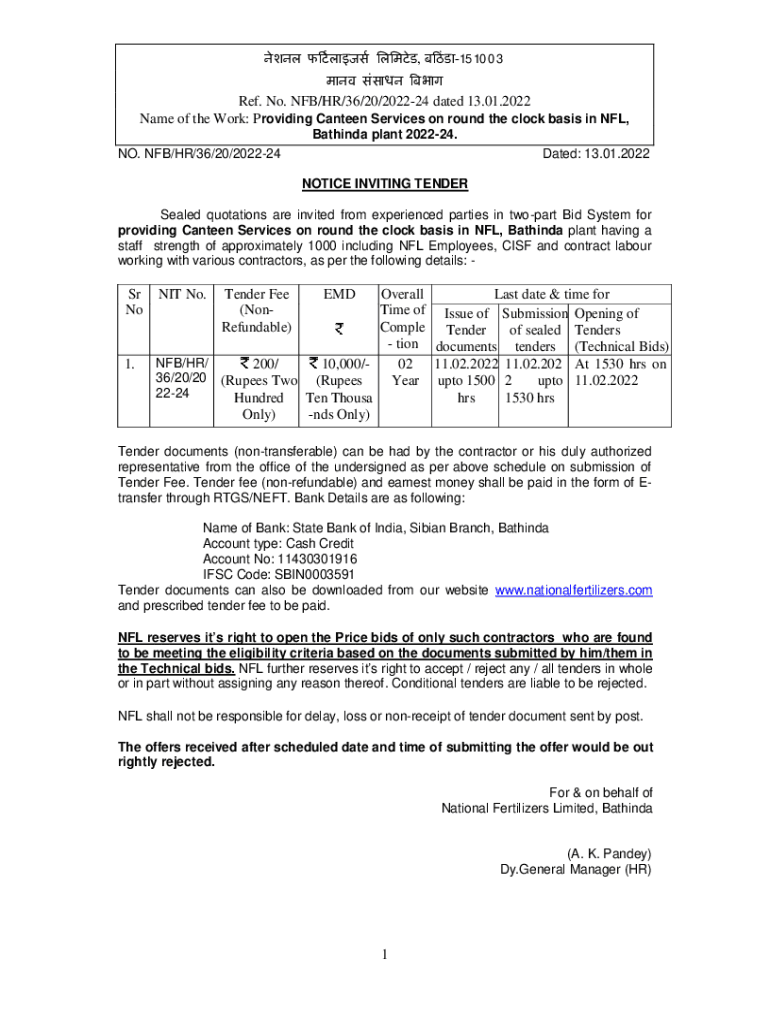 , 151003 Refs. No. NFL/HR/36/20/202224 dated 13.01.2022 Name of the Work: Providing Canteen Services on round the clock basis in NFL, Bathing plant 202224. NO. NFL/HR/36/20/202224Dated: 13.01.2022