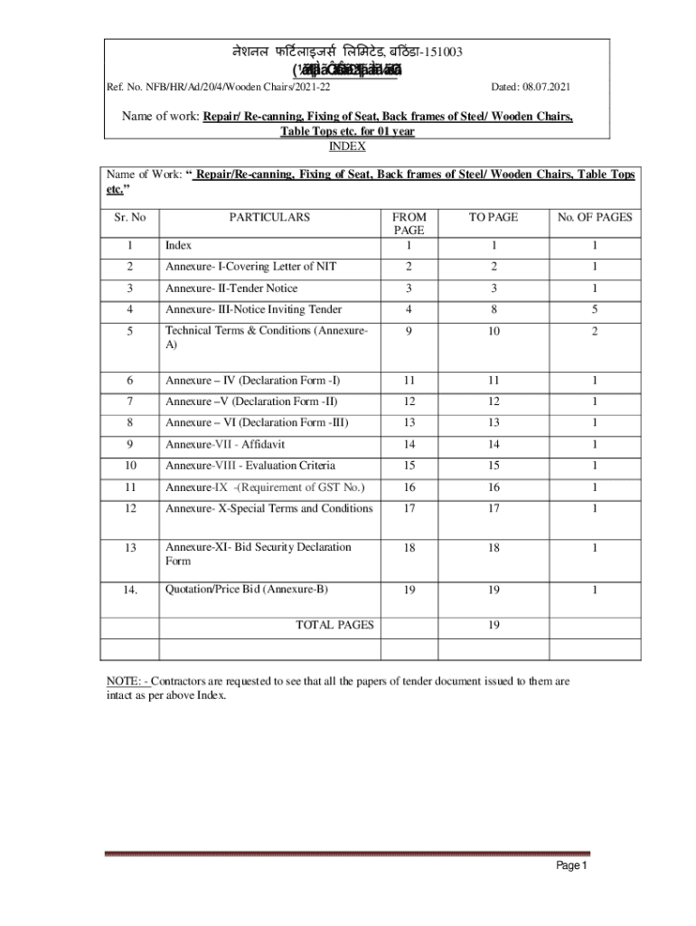 , 151003() Ref. No. NFL/HR/Ad/20/4/Wooden Chairs/202122Dated: 08.07.2021Name of work: Repair/ Recanting, Fixing of Seat, Back frames of Steel/ Wooden Chairs, Table Tops etc. for 01 year INDEX Name