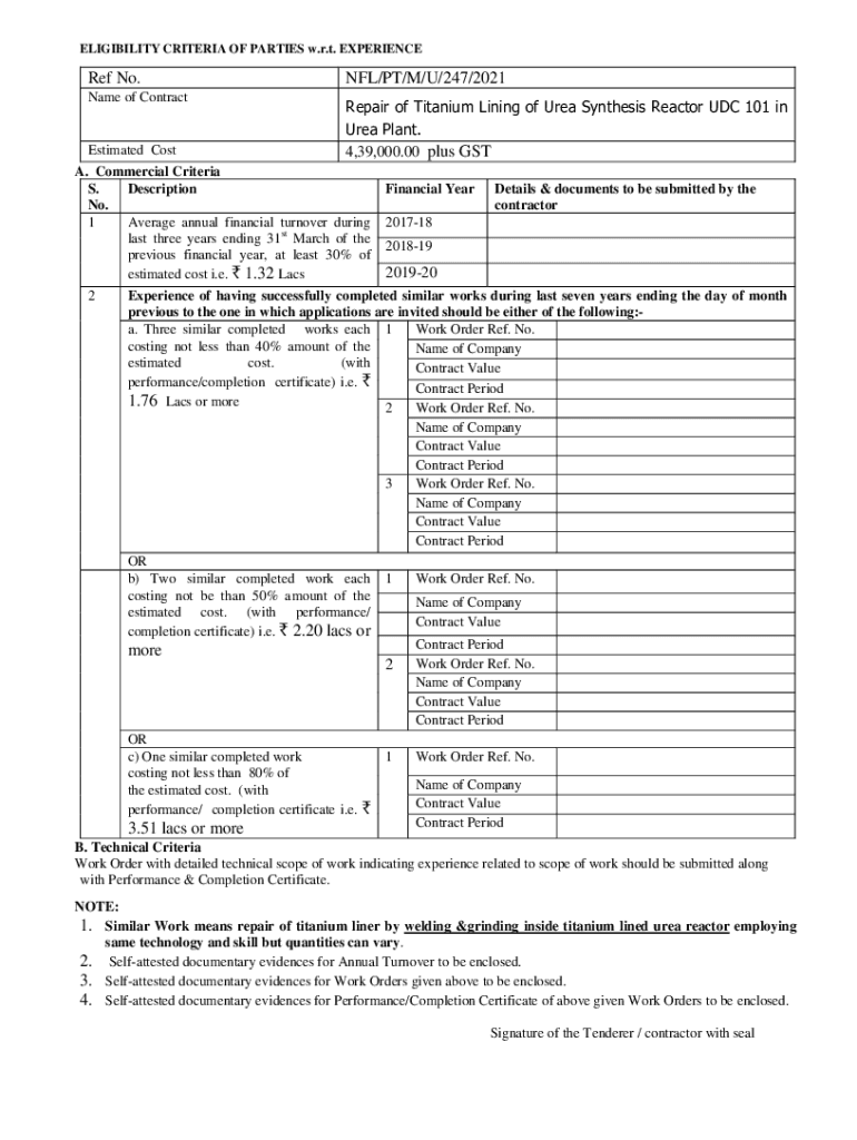 ELIGIBILITY CRITERIA OF PARTIES w.r.t. Experience No. Name of Contract NFL/PT/M/U/247/2021 Repair of Titanium Lining of Urea Synthesis Reactor UDC 101 in Urea Plant. 4,39,000.00 plus Estimated Cost