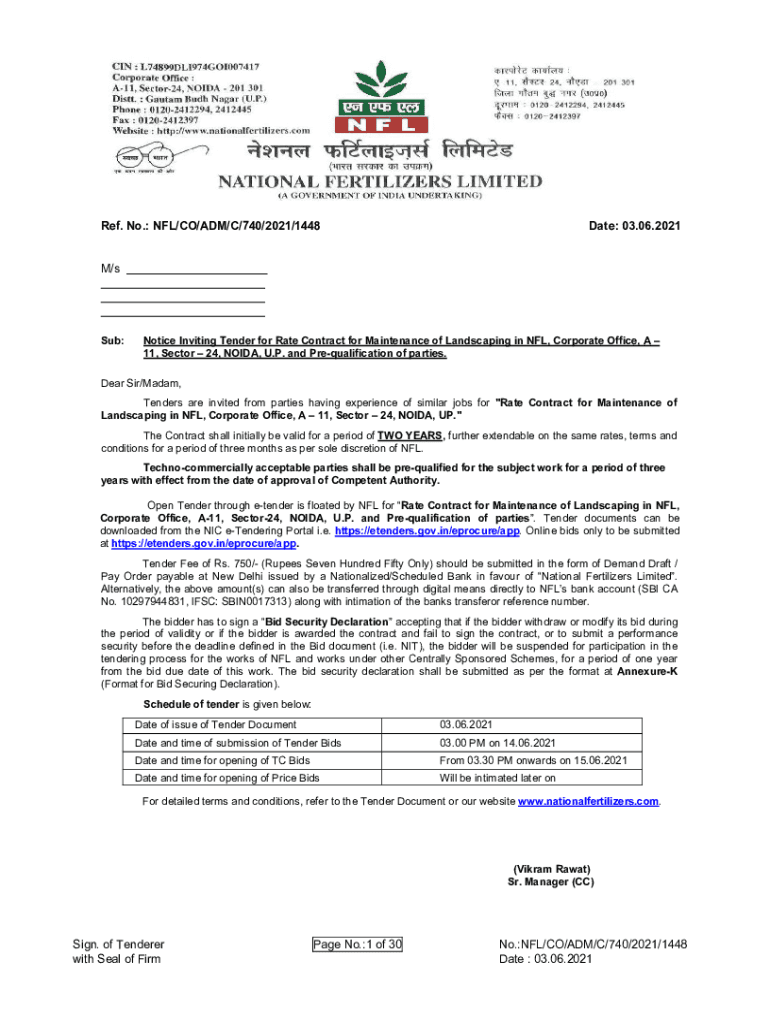 Get the free Notice Inviting Tender for Rate Contract for Maintenance of Landscaping in NFL, Corp...
