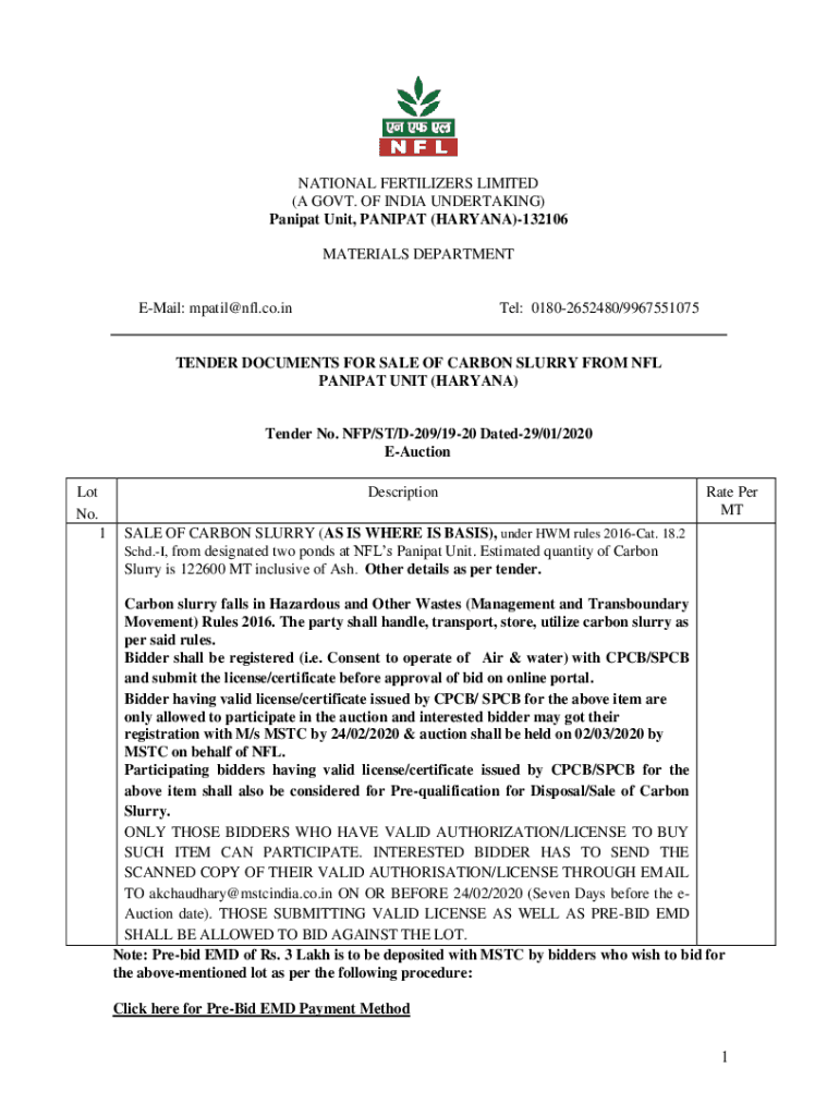MATERIALS Departmental: mpatil@nfl.co.inTel: 01802652480/9967551075TENDER DOCUMENTS FOR SALE OF CARBON