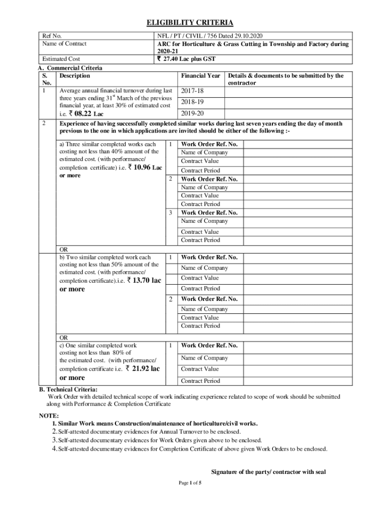 ELIGIBILITY CRITERIA Ref No. Name of Contract NFL / PT / CIVIL / 756 Dated 29.10.2020 ARC for Horticulture & Grass Cutting in Township and Factory during 202021 27.40 Lac plus Estimated Cost A. Commercial