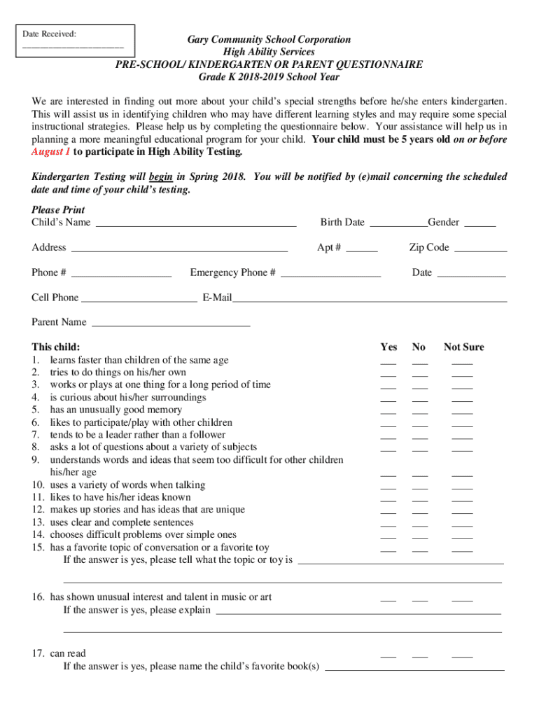 Date Received: ___Gary Community School Corporation High Ability Services PRESCHOOL/ KINDERGARTEN OR PARENT QUESTIONNAIRE Grade K 20182019 School Year are interested in finding out more about your