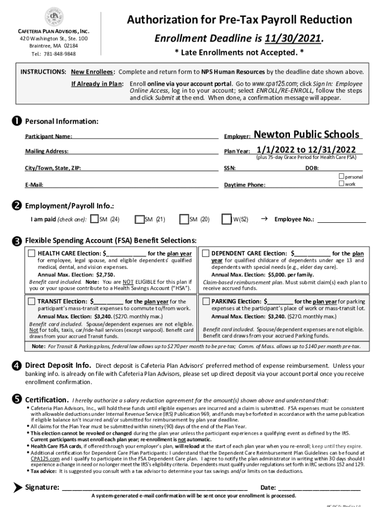 Authorization for Pretax Payroll Reduction CAFETERIA PLAN ADVISORS, INC. Enrollment Deadline is 11/30/2021.420 Washington St., Ste. 100 Braintree, MA 02184 Tel.: 7818489848* Late Enrollments not Accepted.