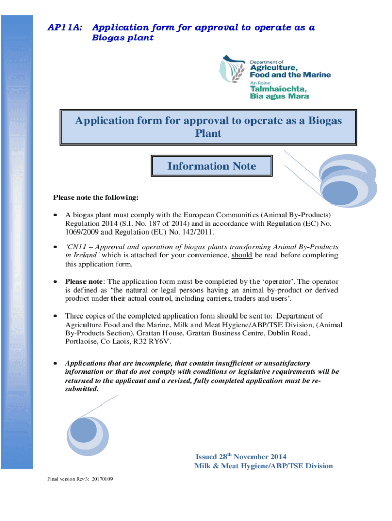 AP11A:Application form for approval to operate as a Biogas plantApplication form for approval to operate as a Biogas Plant Information Note Please note the following: A biogas plant must comply with