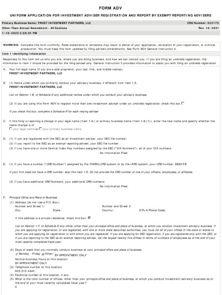 FORM ADV UNIFORM APPLICATION FOR INVESTMENT ADVISER REGISTRATION AND REPORT BY EXEMPT REPORTING ADVISERS Primary Business Name: FROST INVESTMENT PARTNERS, LLC CRD Number: 323172OtherThanAnnual Amendment