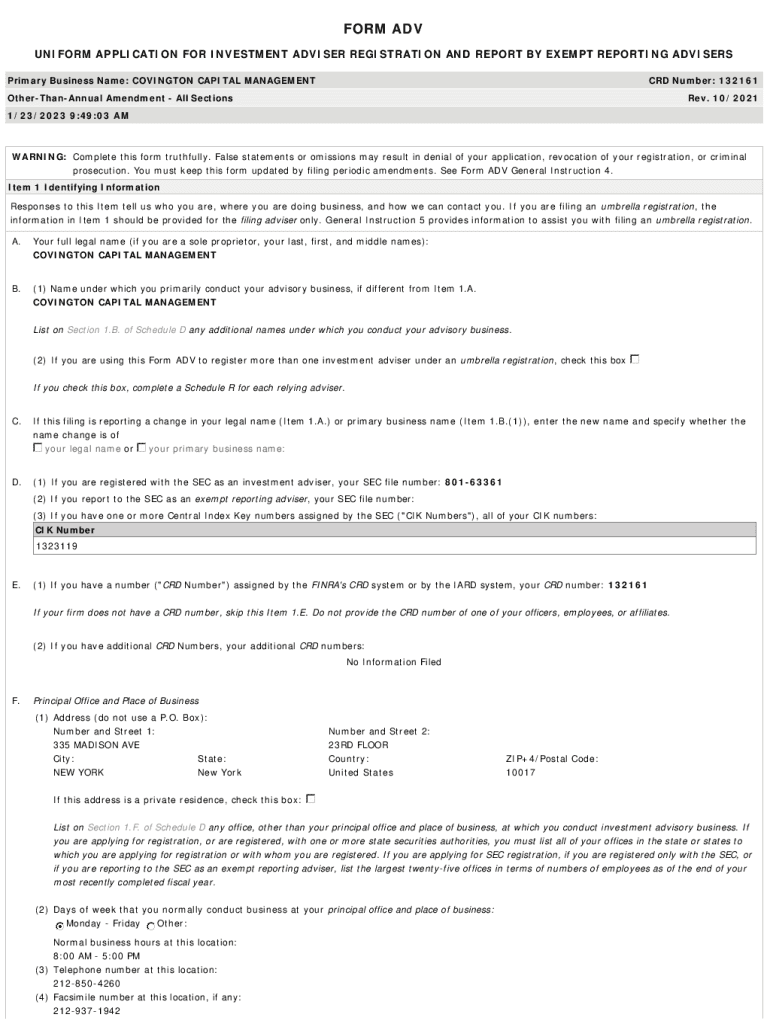 FORM ADV UNIFORM APPLICATION FOR INVESTMENT ADVISER REGISTRATION AND REPORT BY EXEMPT REPORTING ADVISERS Primary Business Name: COVINGTON CAPITAL MANAGEMENT CRD Number: 132161OtherThanAnnual Amendment