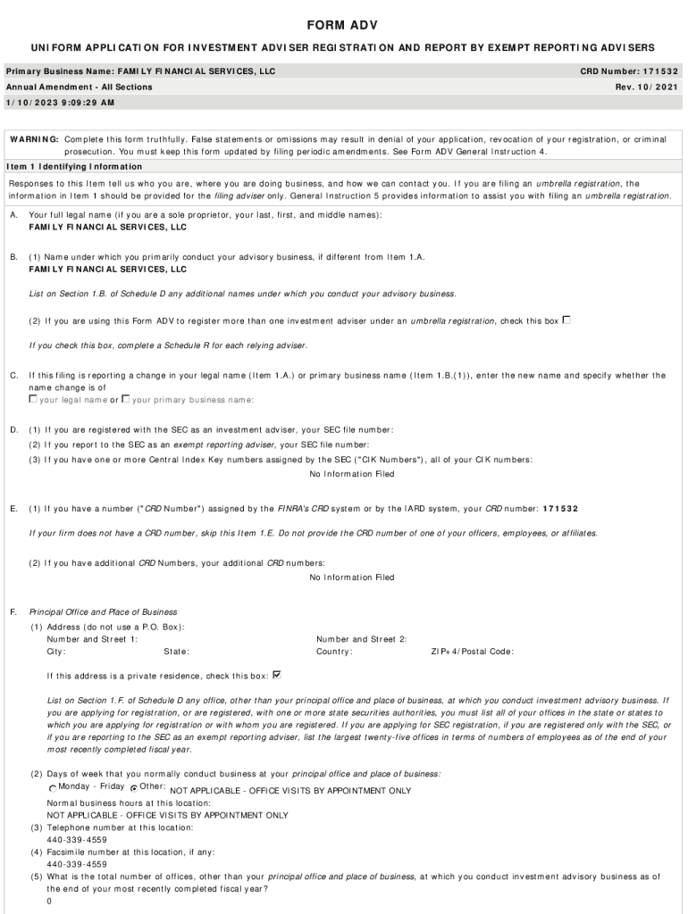 FORM ADV UNIFORM APPLICATION FOR INVESTMENT ADVISER REGISTRATION AND REPORT BY EXEMPT REPORTING ADVISERS Primary Business Name: FAMILY FINANCIAL SERVICES, LLC CRD Number: 171532Annual Amendment All