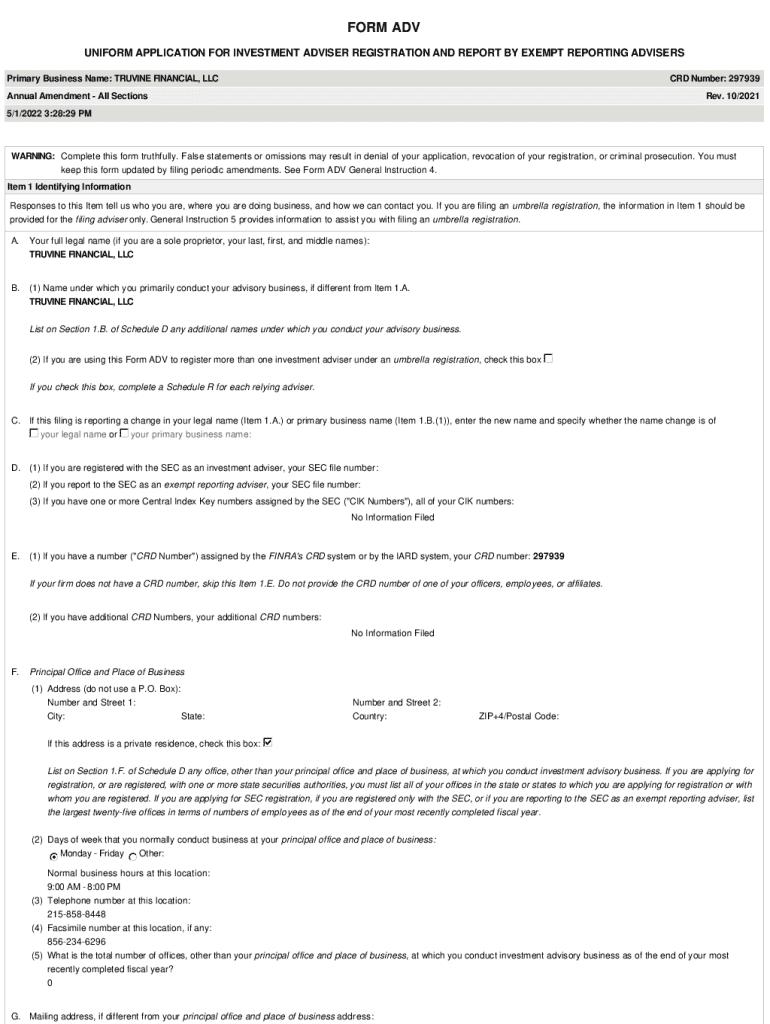 FORM ADV UNIFORM APPLICATION FOR INVESTMENT ADVISER REGISTRATION AND REPORT BY EXEMPT REPORTING ADVISERS Primary Business Name: IRVINE FINANCIAL, LLC CRD Number: 297939Annual Amendment All Sections