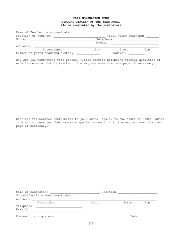 2021 NOMINATION FORM HISTORY TEACHER OF THE YEAR AWARD (To be completed by the nominator) Name of Teacher being nominated: ___ Position of nominee: ___ Total years teaching: ___ School: ___ Telephone:
