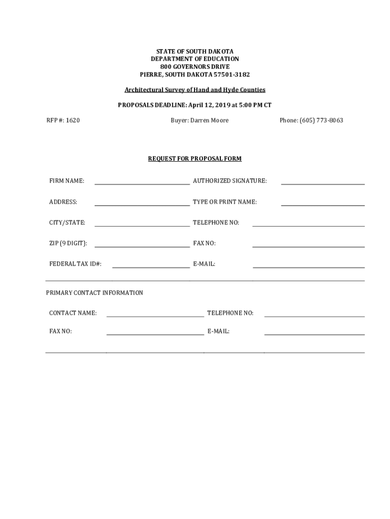 STATE OF SOUTH DAKOTA DEPARTMENT OF EDUCATION 800 GOVERNORS DRIVE PIERRE, SOUTH DAKOTA 575013182 Architectural Survey of Hand and Hyde Counties PROPOSALS DEADLINE: April 12, 2019, at 5:00 PM CT RFP