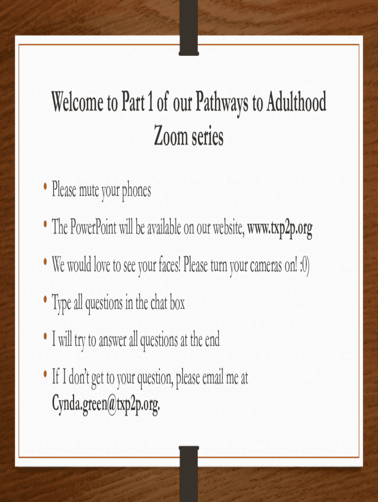 Welcome to Part 1 of our Pathways to Adulthood Zoom series Please mute your phones The PowerPoint will be available on our website, www.txp2p.orgWe would love to see your faces! Please turn your cameras