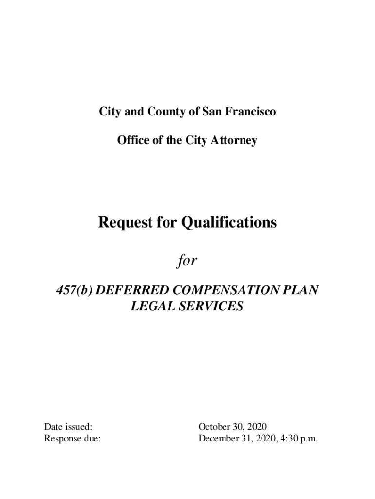 City and County of San Francisco Office of the City AttorneyRequest for Qualifications for 457(b) DEFERRED COMPENSATION PLAN LEGAL SERVICESDate issued: Response due:October 30, 2020, December 31,