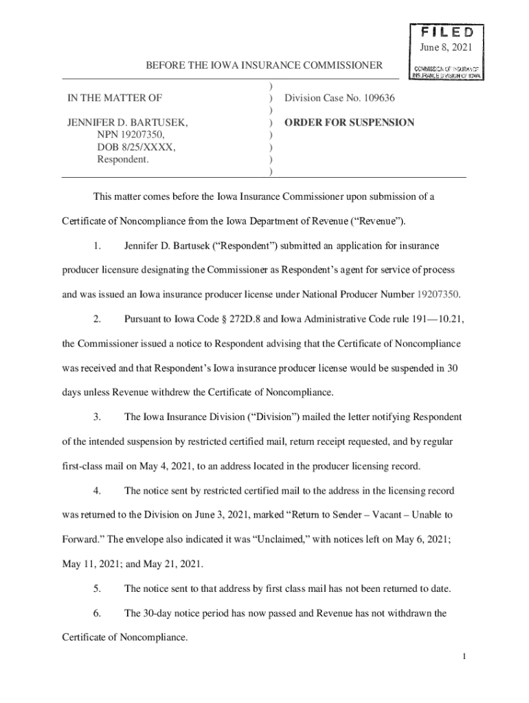 June 8, 2021, BEFORE THE IOWA INSURANCE COMMISSIONER IN THE MATTER OF JENNIFER D. BARTEK, NPN 19207350, DOB 8/25/XXX, Respondent.) )))))))Division Case No. 109636 ORDER FOR Suspensions matter comes