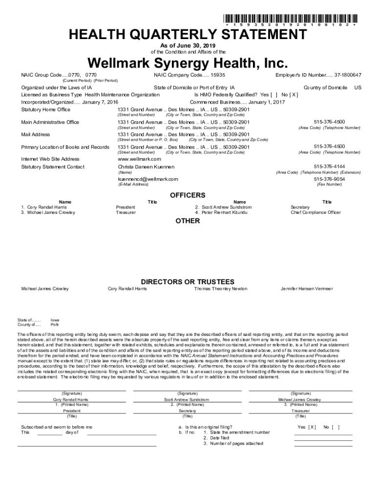 *15935201920100102×HEALTH QUARTERLY STATEMENT As of June 30, 2019, of the Condition and Affairs of theWellmark Synergy Health, Inc. NAIL Group Code.....0770, 0770NAIC Company Code..... 15935Employer\'s