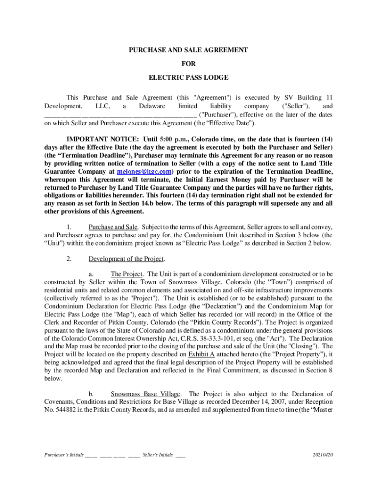 PURCHASE AND SALE AGREEMENT FOR ELECTRIC PASS LODGE This Purchase and Sale Agreement (this \” Agreement\”) is executed by SV Building 11 Development, LLC, a Delaware limited liability company