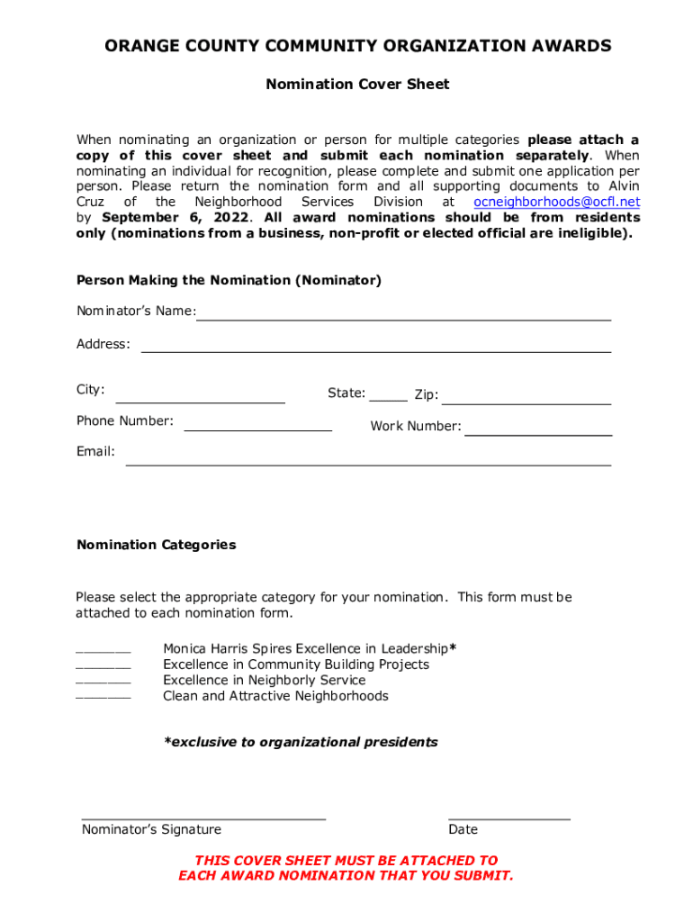 ORANGE COUNTY COMMUNITY ORGANIZATION AWARDS Nomination Cover Heathen nominating an organization or person for multiple categories please attach a copy of this cover sheet and submit each nomination