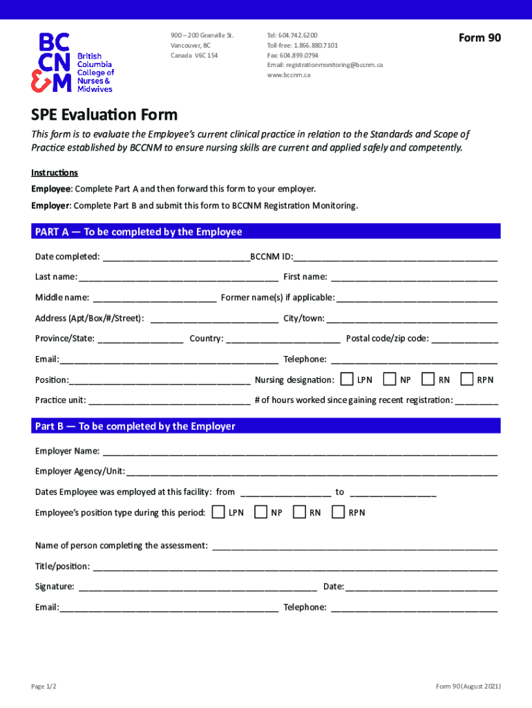 900 200 Granville St. Vancouver, BC Canada V6C 1S4Form 90Tel: 604.742.6200 Toll free: 1.866.880.7101 Fax: 604.899.0794 Email: registrationmonitoring@bccnm.ca www.bccnm.caSPE Evaluation Form This form