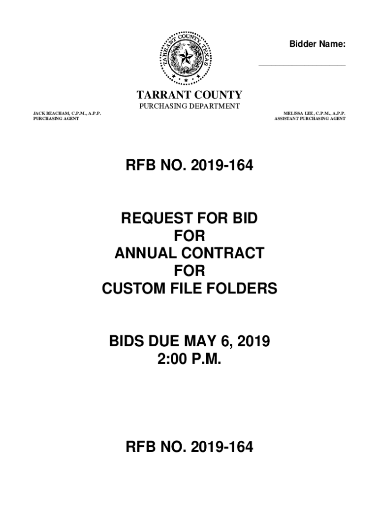 Bidder Name: ___TARRANT COUNTY PURCHASING DEPARTMENT JACK BEA CHAM, C.P.M., A.P.P. PURCHASING AGENTMELISSA LEE, C.P.M., A.P.P. ASSISTANT PURCHASING AGENT NO. 2019164REQUEST FOR BID FOR ANNUAL CONTRACT