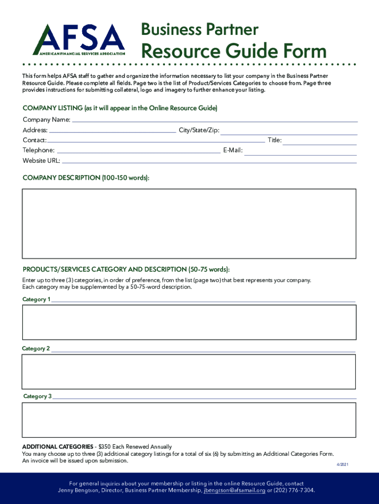Business PartnerResource Guide An online guide to help your company highlight products and services directly to consumer finance industry decision makersAFSA is proud to provide the online Business