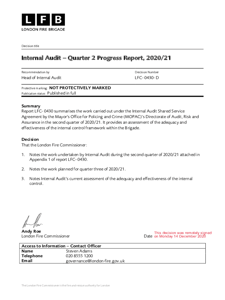 Recommendation decision Number Head of Internal Audit LFC 0430 NOT PROTECTIVELY MARKED
