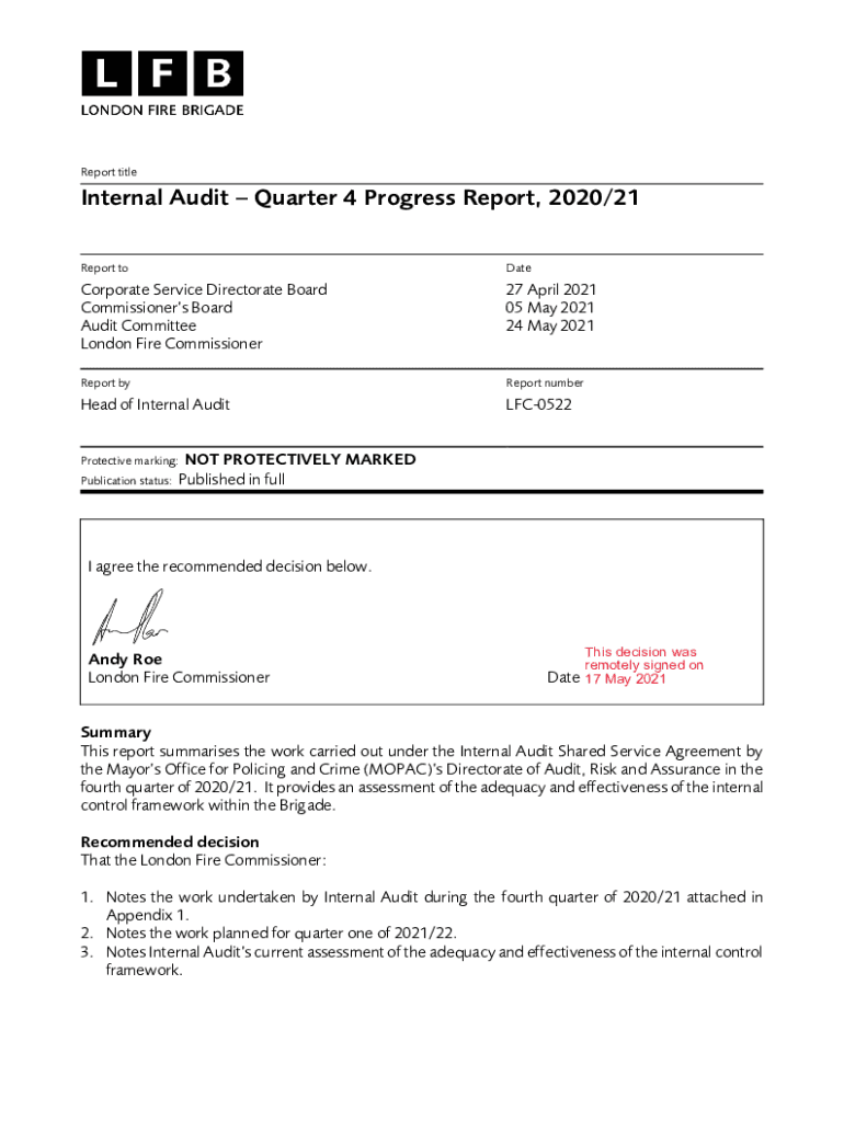 Report titleInternal Audit Quarter 4 Progress Report, 2020/21 Report toDateCorporate Service Directorate Board Commissioners Board Audit Committee London Fire Commissioner27 April 2021 05 May 2021