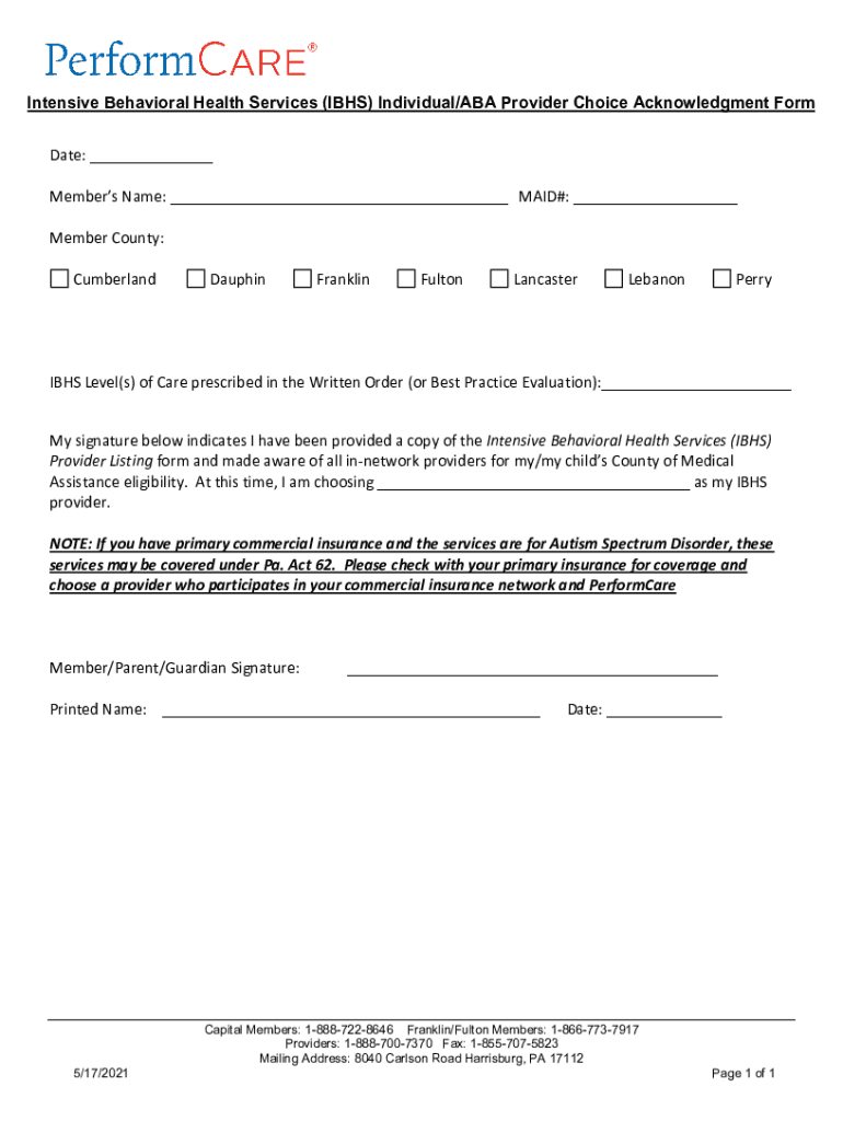 Intensive Behavioral Health Services (IHS) Individual/ABA Provider Choice Acknowledgment Form Date: ___ Members Name: ___ MAID#: ___ Member County: CumberlandDauphinFranklinFultonLancasterLebanonPerryIBHS