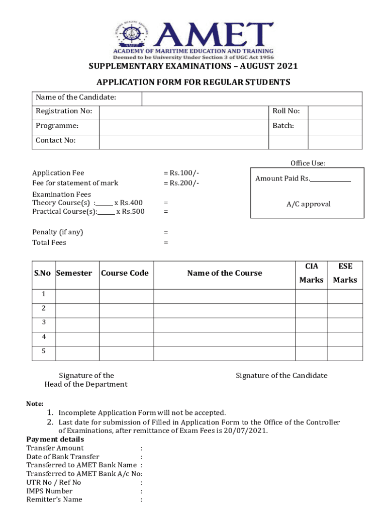 SUPPLEMENTARY EXAMINATIONS AUGUST 2021 APPLICATION FORM FOR REGULAR STUDENTS Name of the Candidate: Registration No:Roll No:Program:Batch:Contact No: Office Use: Application Fee for statement of mark