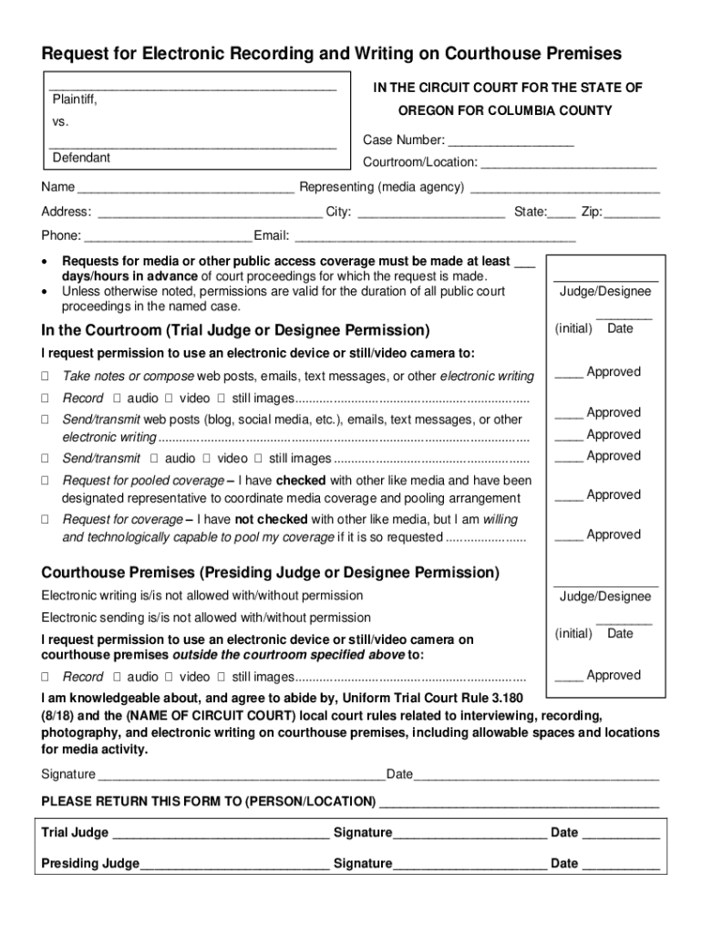 Request for Electronic Recording and Writing on Courthouse Premises ___ Plaintiff, IN THE CIRCUIT COURT FOR THE STATE OF OREGON FOR COLUMBIA COUNTY vs. ___ Defendant Case Number: ___ Courtroom/Location: